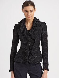 And finally remember: Coco Chanel is the image you should be channeling, and that pearls are NEVER a bad look; think reserved…quilted bag, nice jacket, etc. Here’s a conservative, but of the moment non-boring jacket I found at Saks. by Armani