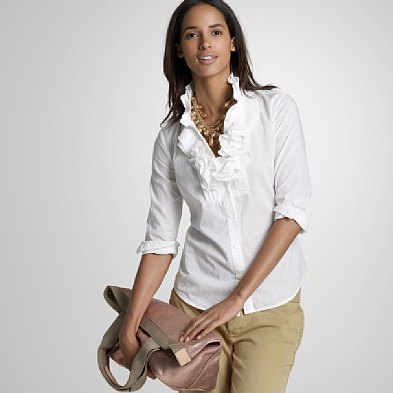 Ruffles are very now, so you could rock a colorful ruffle blouse like this one from J.Crew under a nicely tailored cardigan (charcoal grey says: I came to work today!) or blazer with a slender metallic belt worn with nicely cut pants with a bit of a flare and some high shoes.