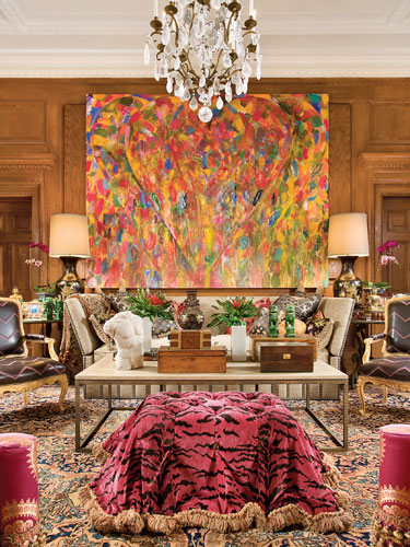 Irreverant? A little bit, you know classic wood paneling, and pink zebra throw? Enormous over sized wall covering–couldn’t love anymore. Bravo.