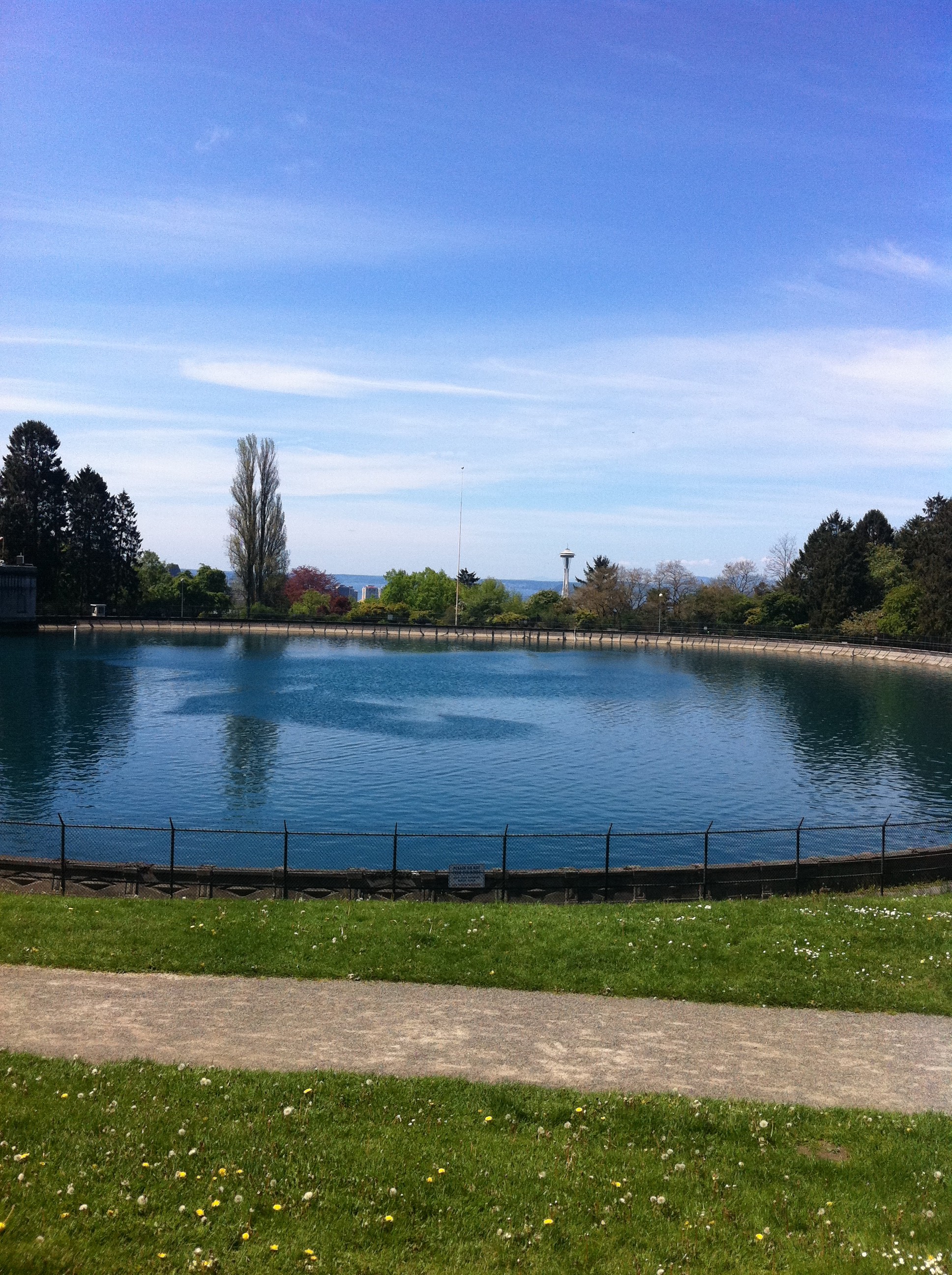 Up the hill in the park, a peek-a-boo view of The Space Needle off in the distance.