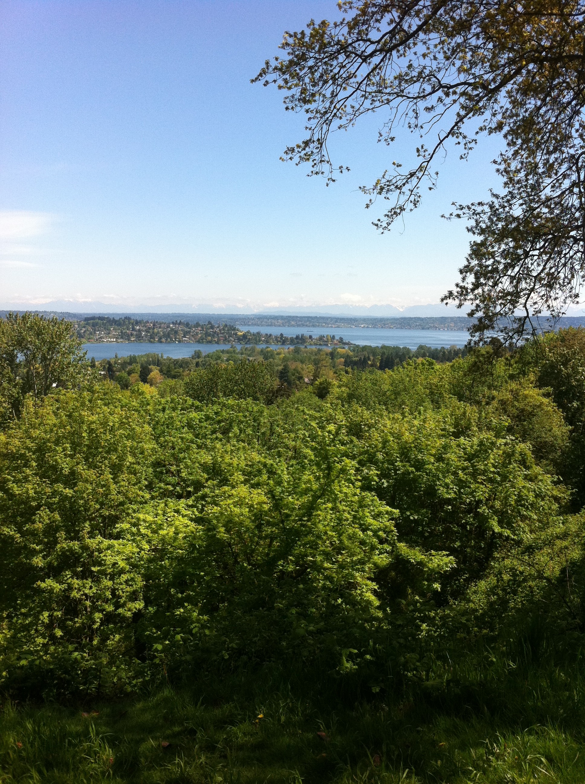 Still snow capped Cascades Mountains off on the distance, Lake Washington in the forefront.