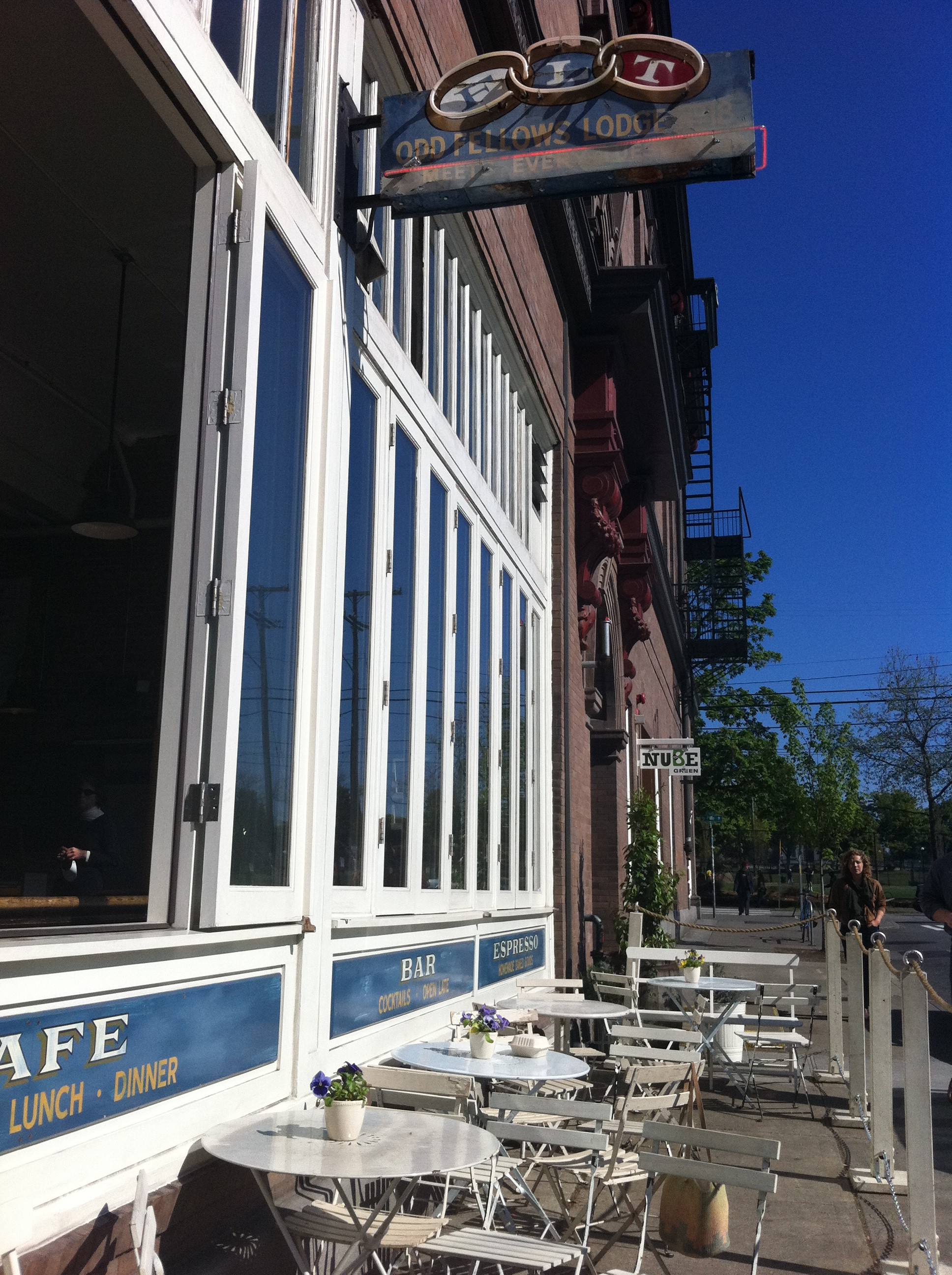 My 2nd cup of Joe and some quick baked eggs (served in a small skillet with ham & gruyere, yum!) outside today at Oddfellows Cafe this a.m. This spot makes me happy, plain and simple.