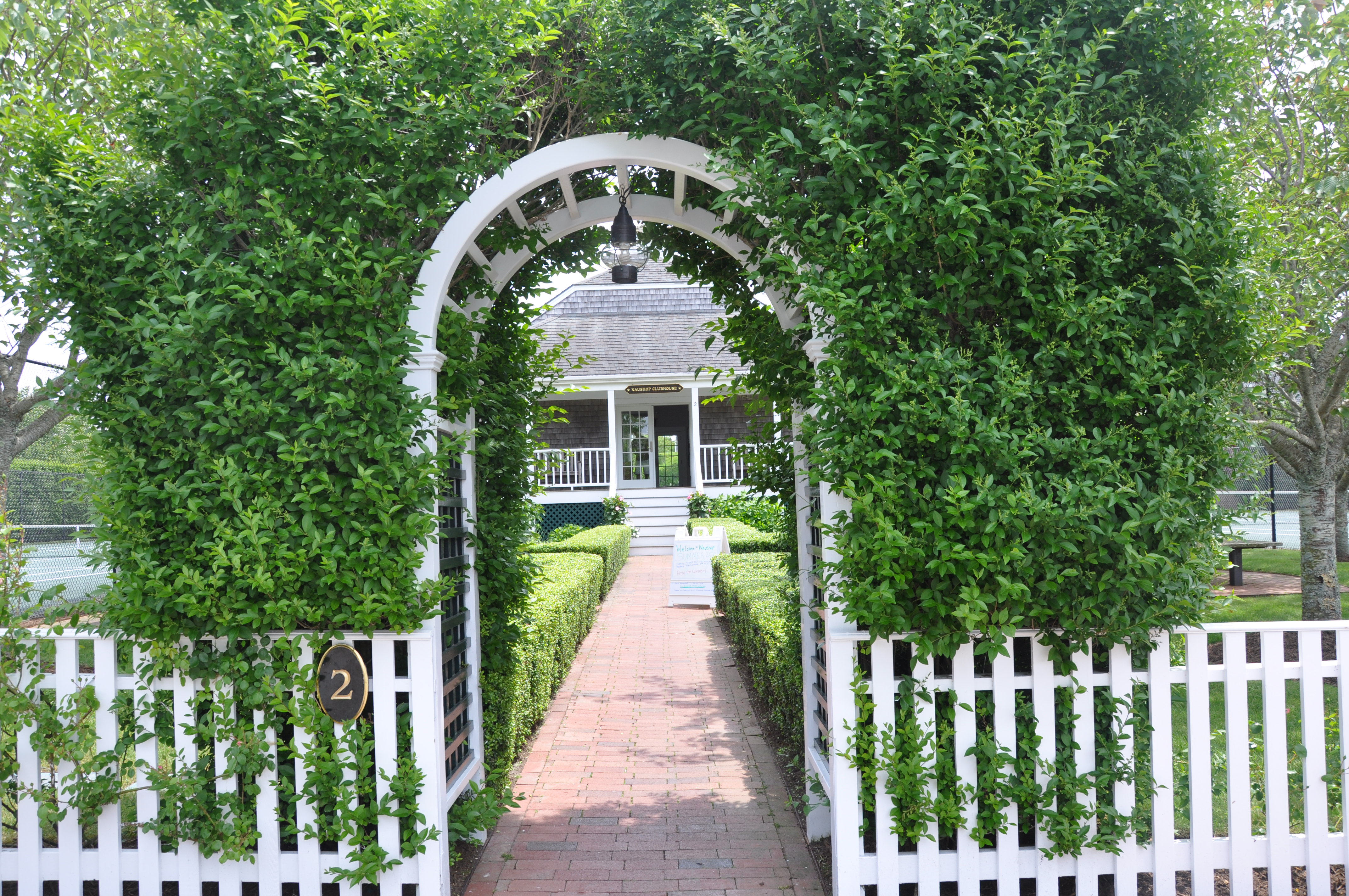 Naushop Arbor Entrance to pool, tennis courts and shuffleboard! Love the onion lamp hanging down in the middle too.