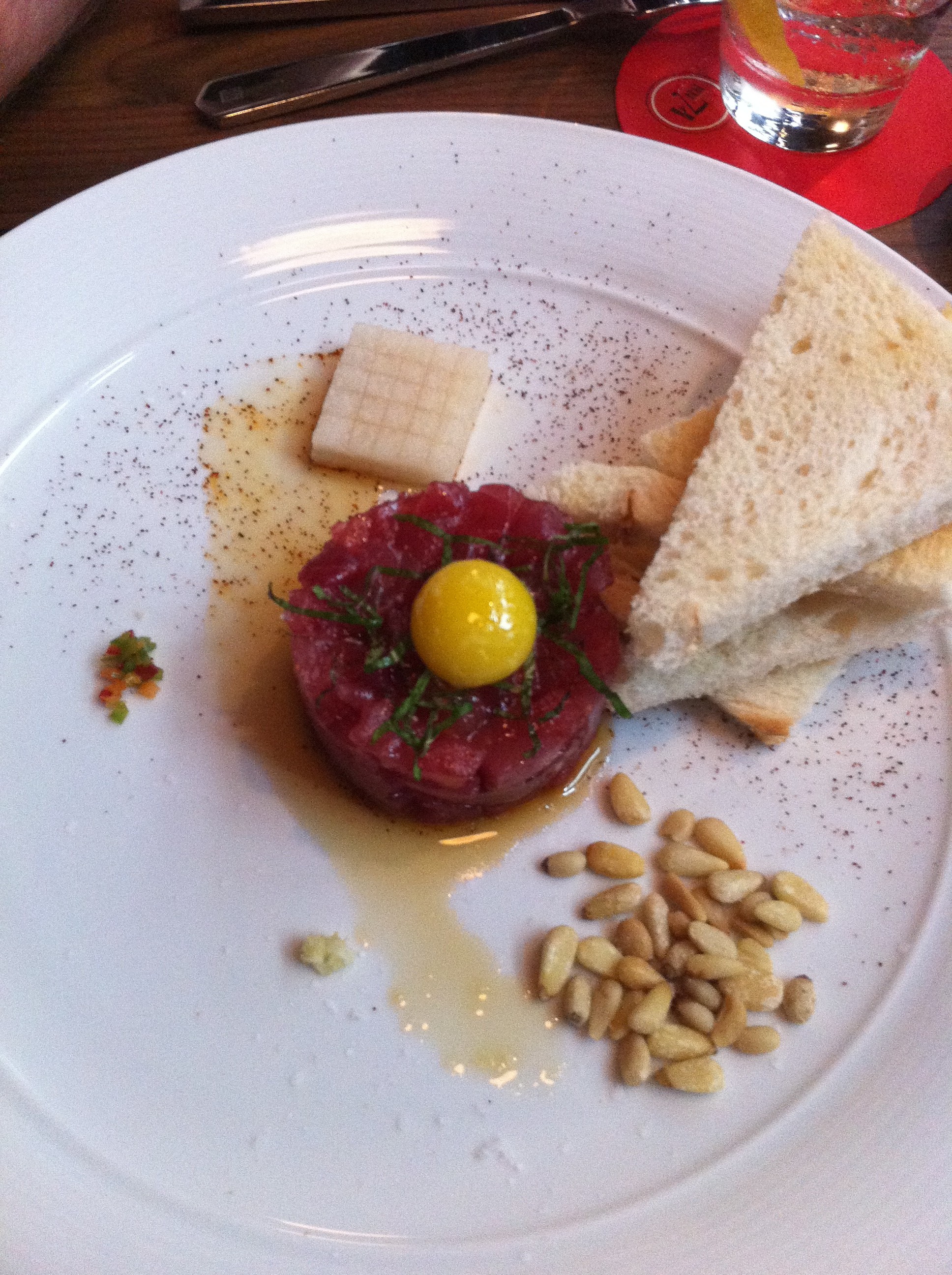 Amazingly fresh Ahi, topped with a perfect little quail egg, wonderful seasonings and accoutrement on the side, such as perfectly diced Asian pear (that is the square grid looking thing), pine nuts, scotch bonnet pepper, mint and sesame oil–mixed table side before heaping onto toast points.