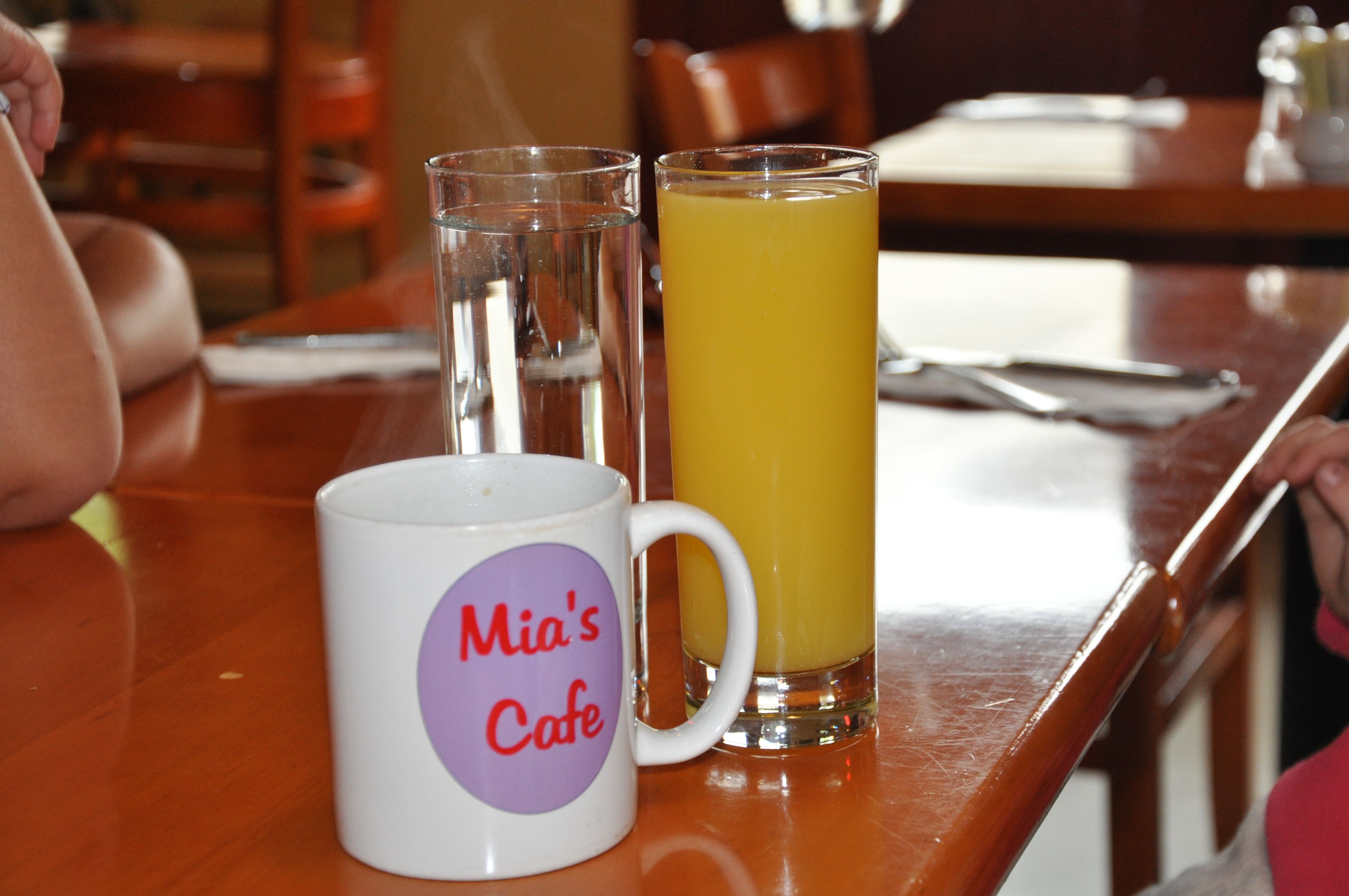 Early in the morning, one must promptly get into town to Mia’s Cafe. Do you like the beverage trio here of Mimosa, coffee and water? Why get one bevvie when you can have three?