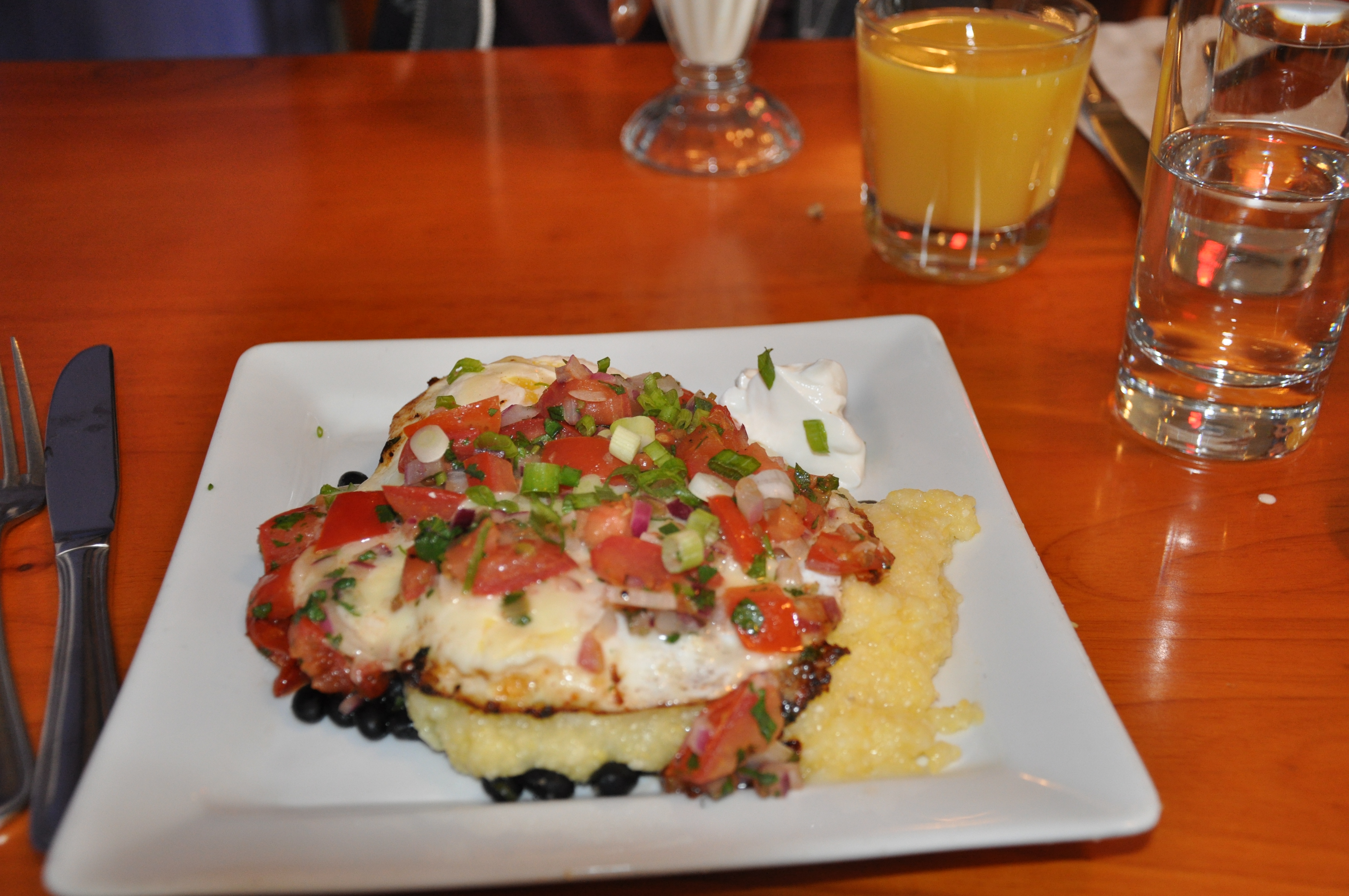 Resistance is futile when it comes to steaming hot huevos rancheros served, on a bed of polenta, and next to a nice helping of spicy black beans. Yes, please.