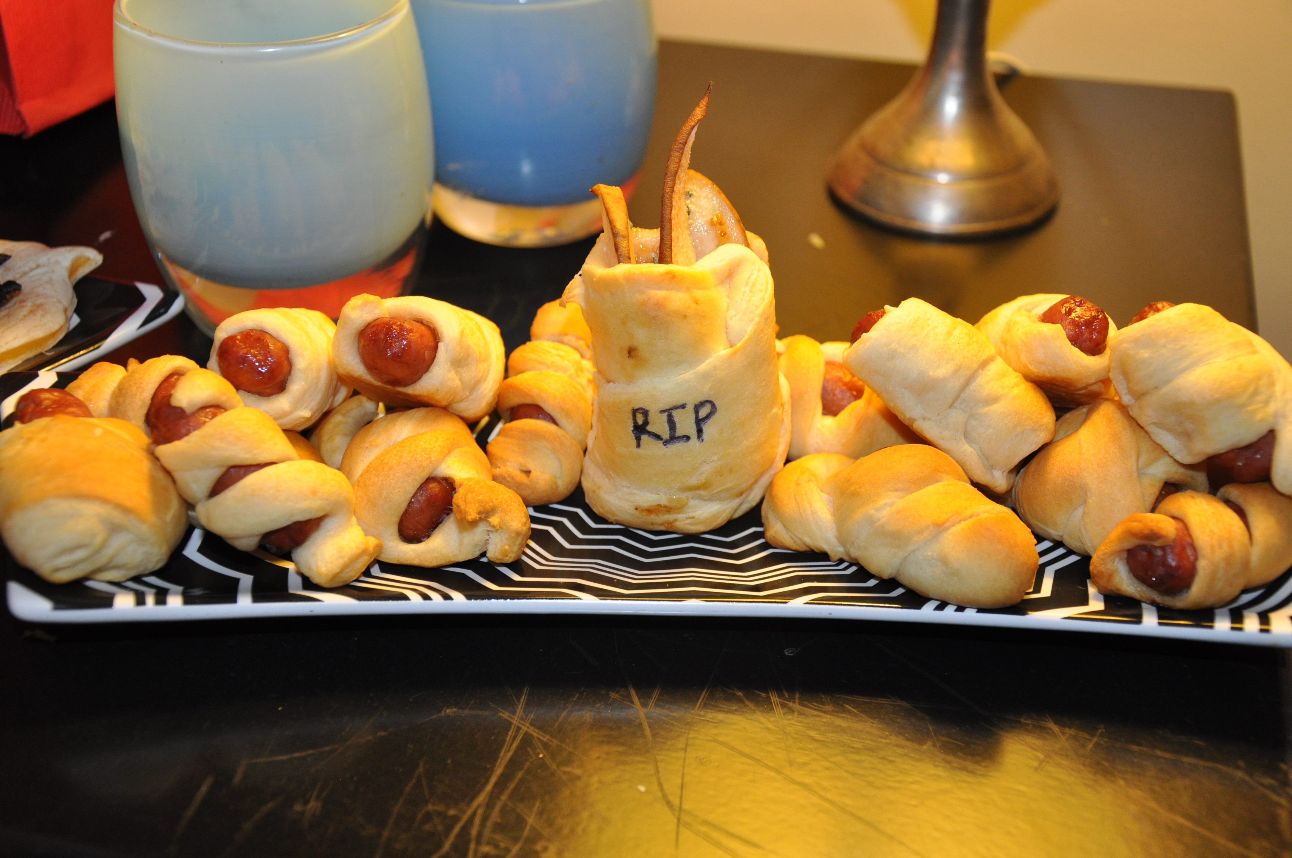 In the meantime, here’s a little sneaky peakie before the full post. Mummies and tombstones. The concept for each thing we made was something fun for the kids to eat (i.e. wrapped weiners) and a yummy version for adults (thinly sliced pear and prosciutto with fig jam and blue cheese, wrapped in dough) too.