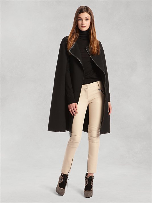 Refined: A little leather trim on this uber-on-trend DKNY cape says, I’m not riding my horsie through the woods today.