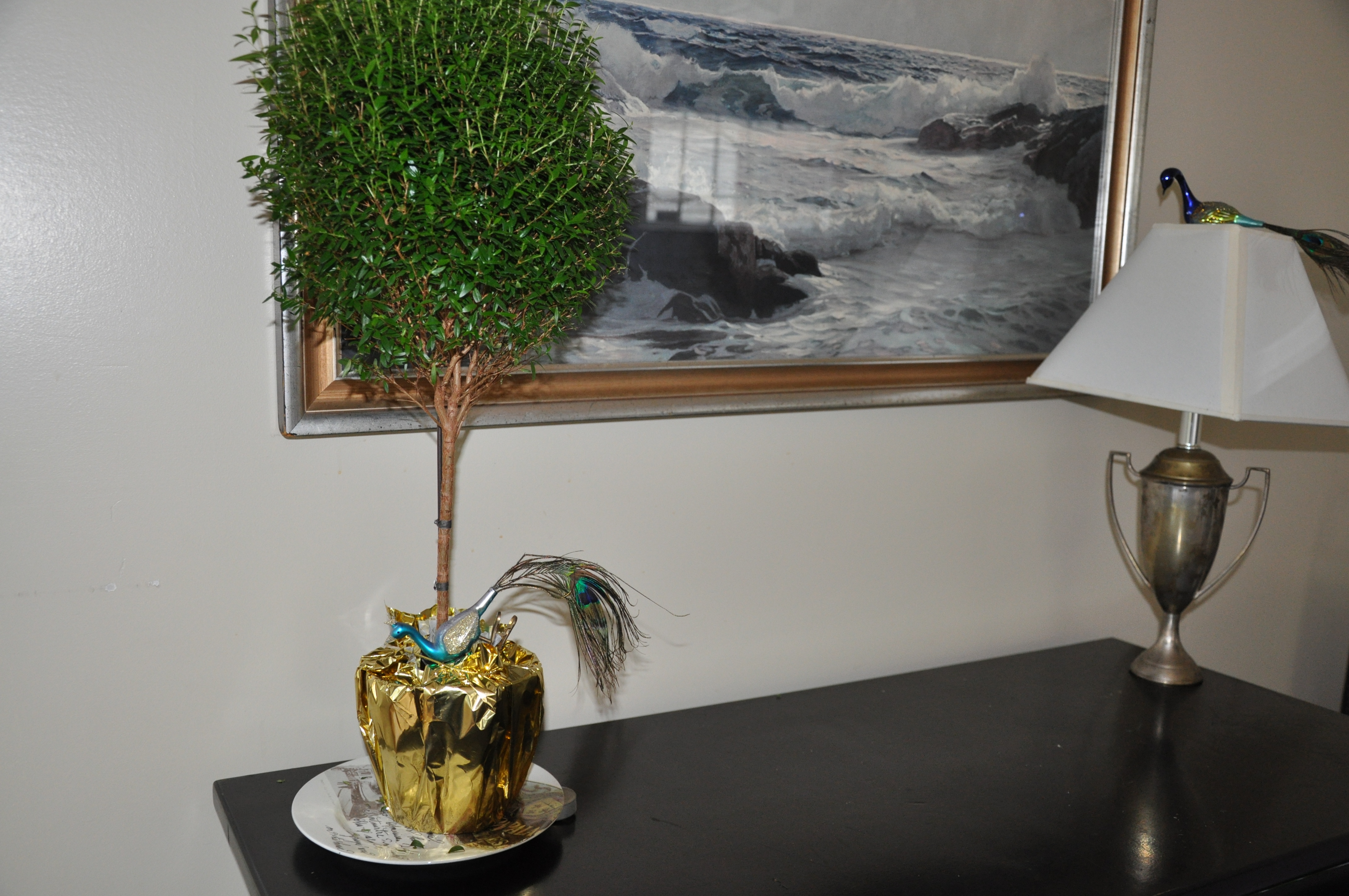 So one got clipped on to this cute topiary that was also a gift for the holidays, thanks Bill. And the other onto an antique lamp. I need to get that topiary planted by the way, but there’s something about the gold wrapper that’s still working for me right now. Must be a “tweener” thing.