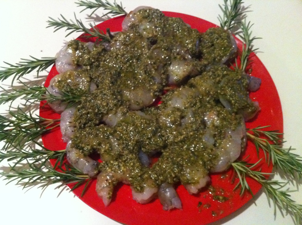 3. Brush with olive oil or this particular time, we had some leftover Pesto, that we swept the shrimp with.