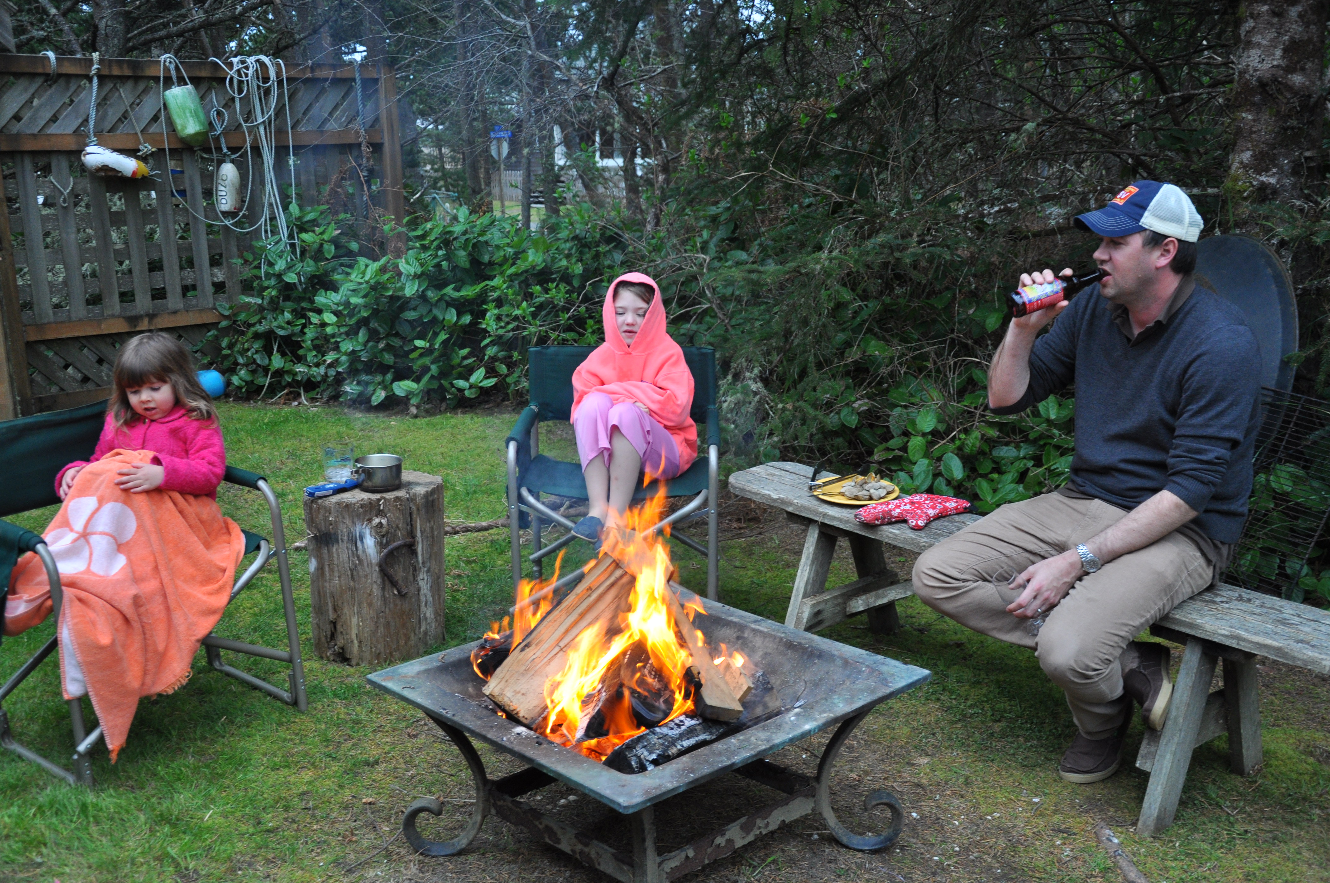 Warming up with friends and throwing back a cold one.