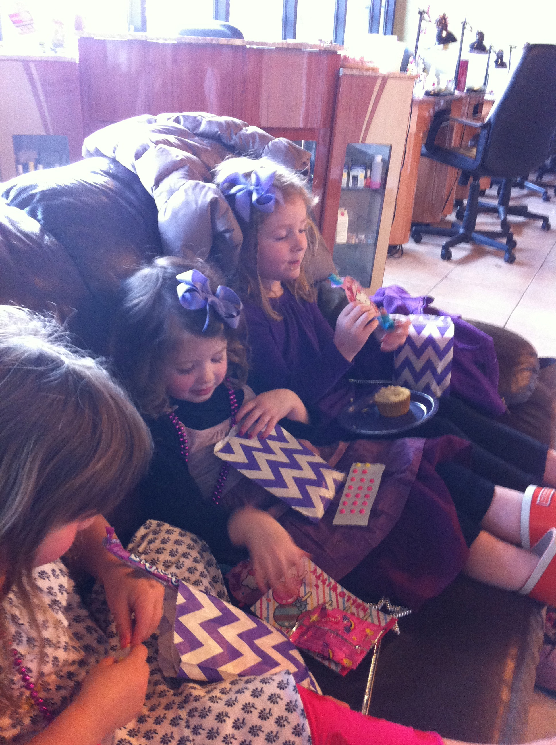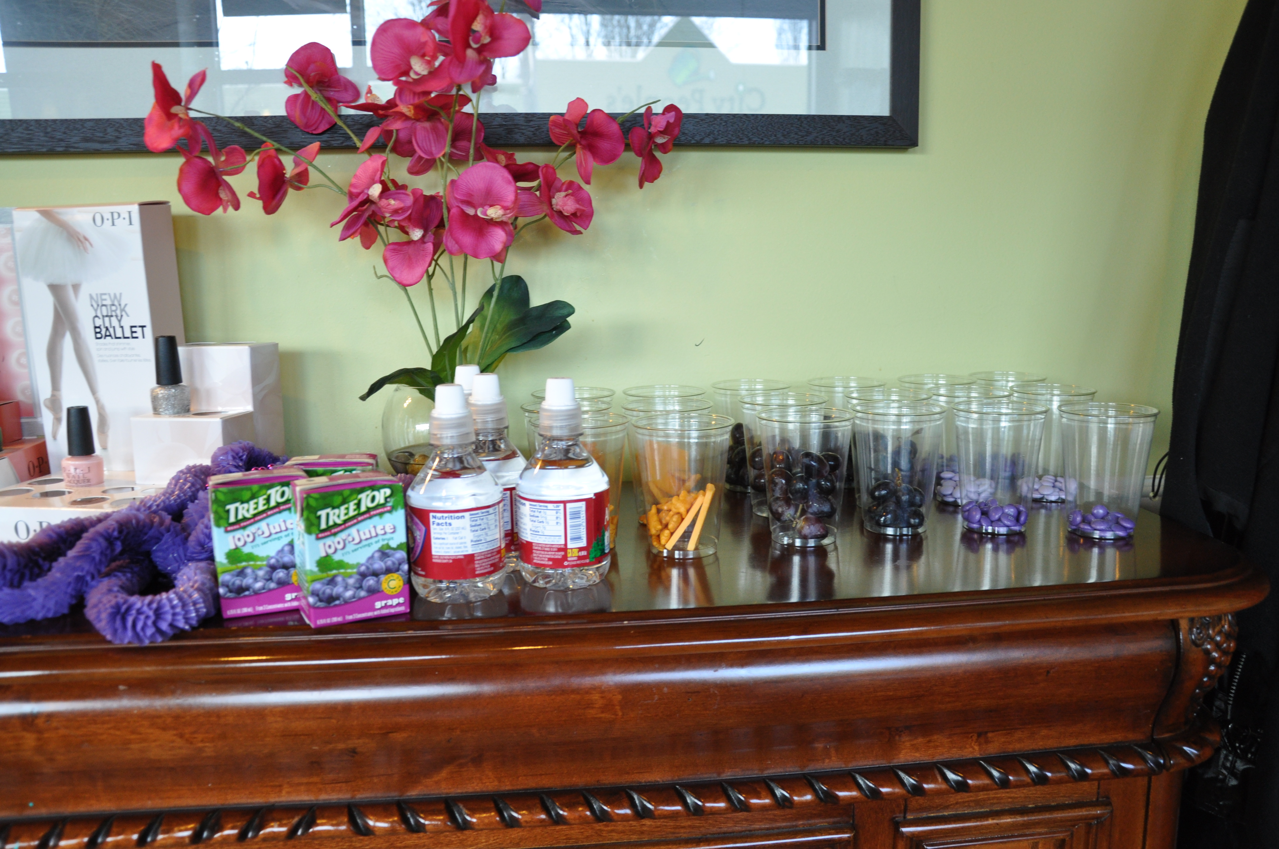 While being polished, they noshed on some purple snacks like purple M&M’s which I found at The Red Balloon Company, globe grapes, and golden crackers.