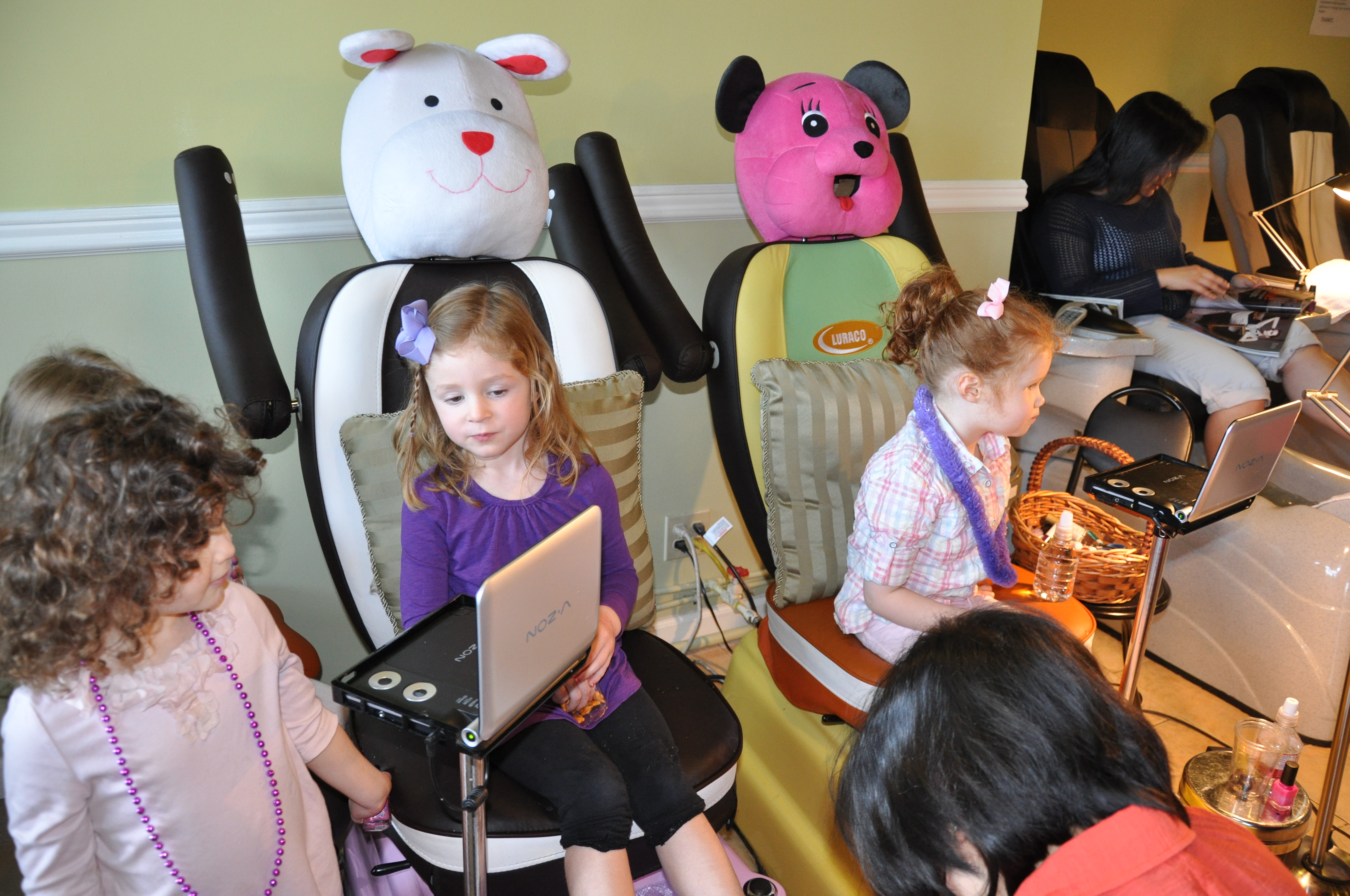 For the entertainment portion of the birthday party we gathered some of our best little buddies at our favorite local nail spa, Madison Avenue Nail Spa for little girl mani pedis. And you’ll never guess what was playing on the DVD??? Entangled and entranced…