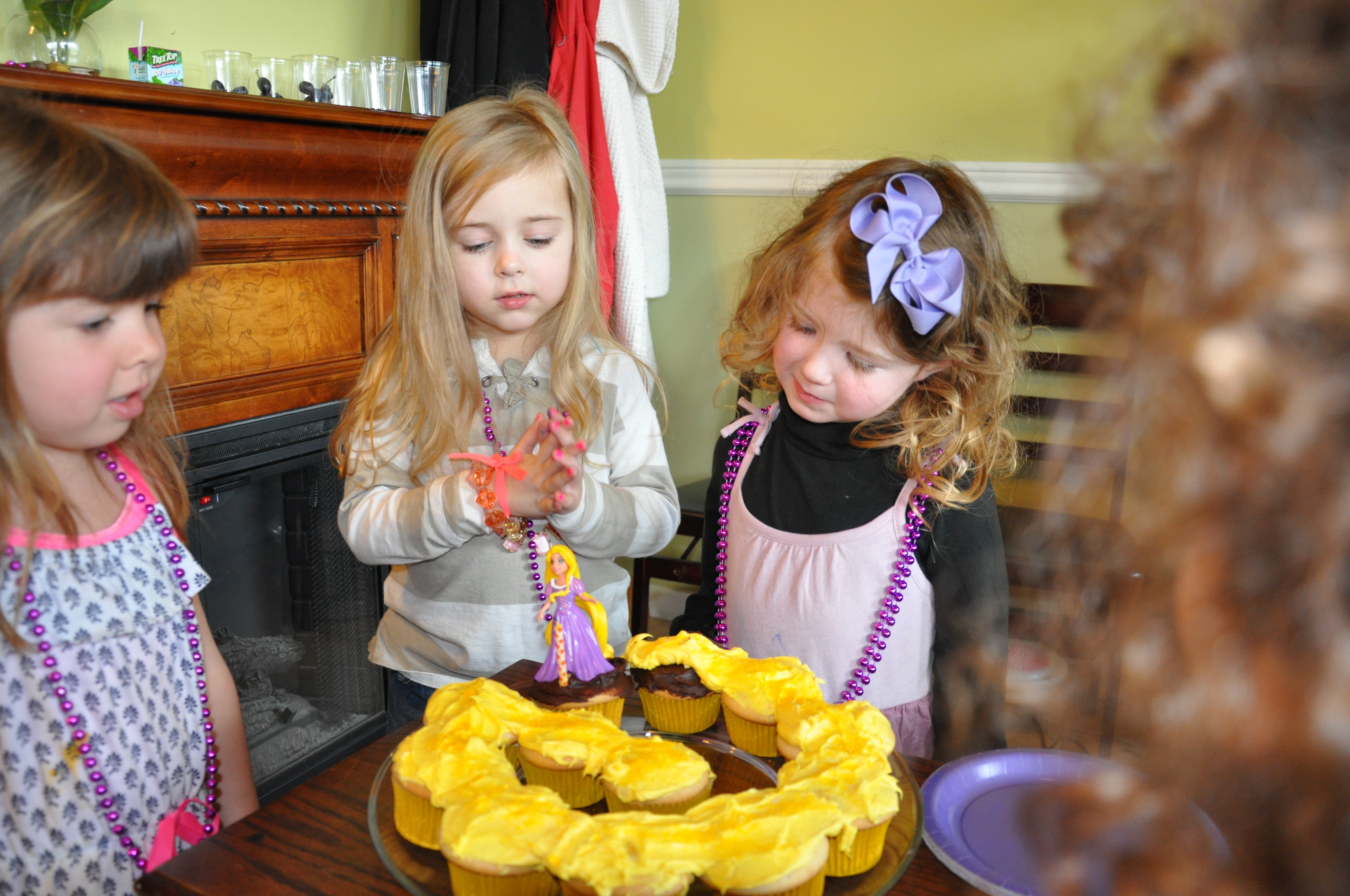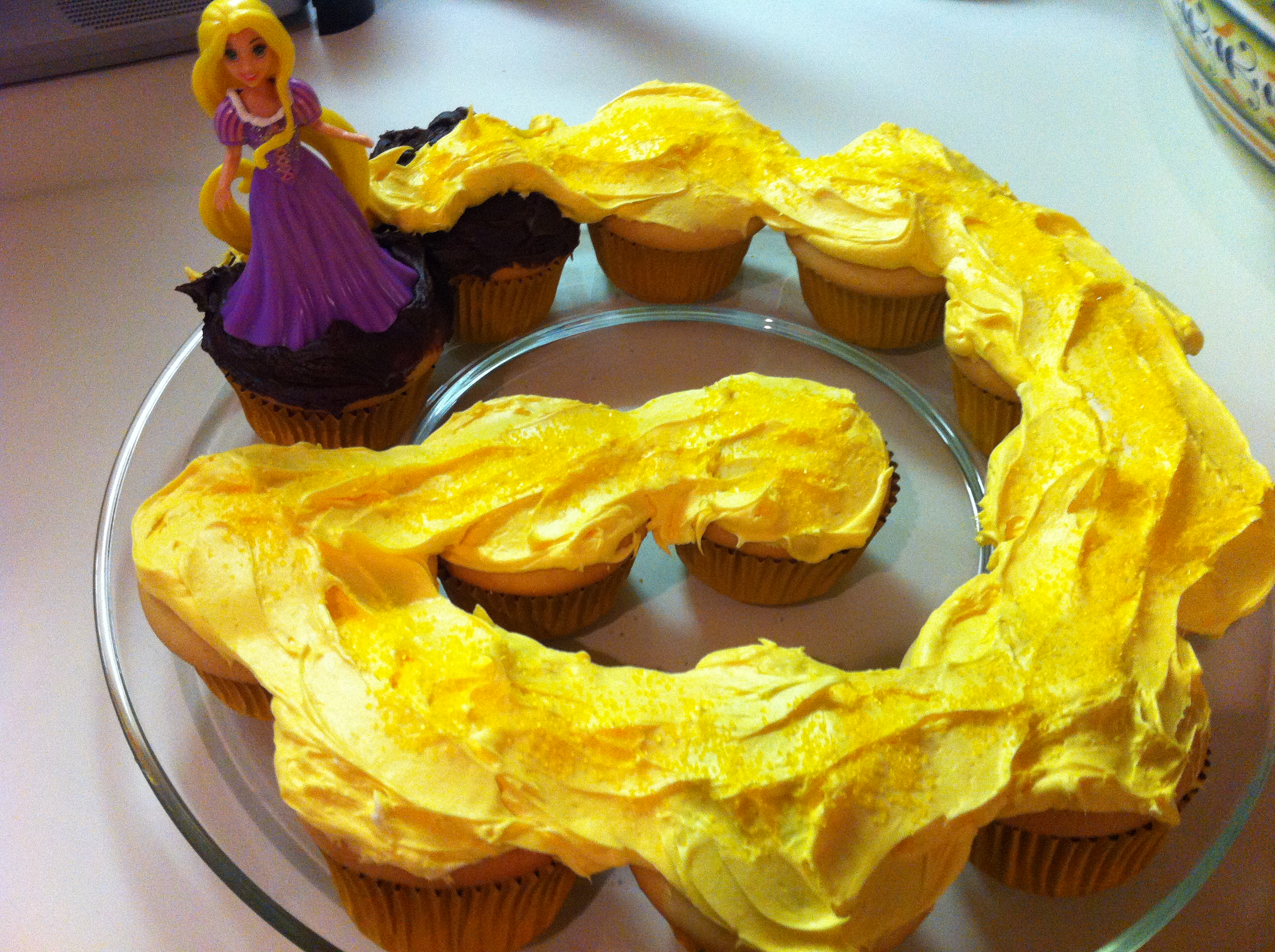 Homemade baked goods are always a plus. This project was actually easy, I made a dozen or so cupcakes, iced most yellow (just added some yellow coloring to whipped icing) a few chocolate and some strategic placement and we POOF we have Rapunzel’s golden hair.