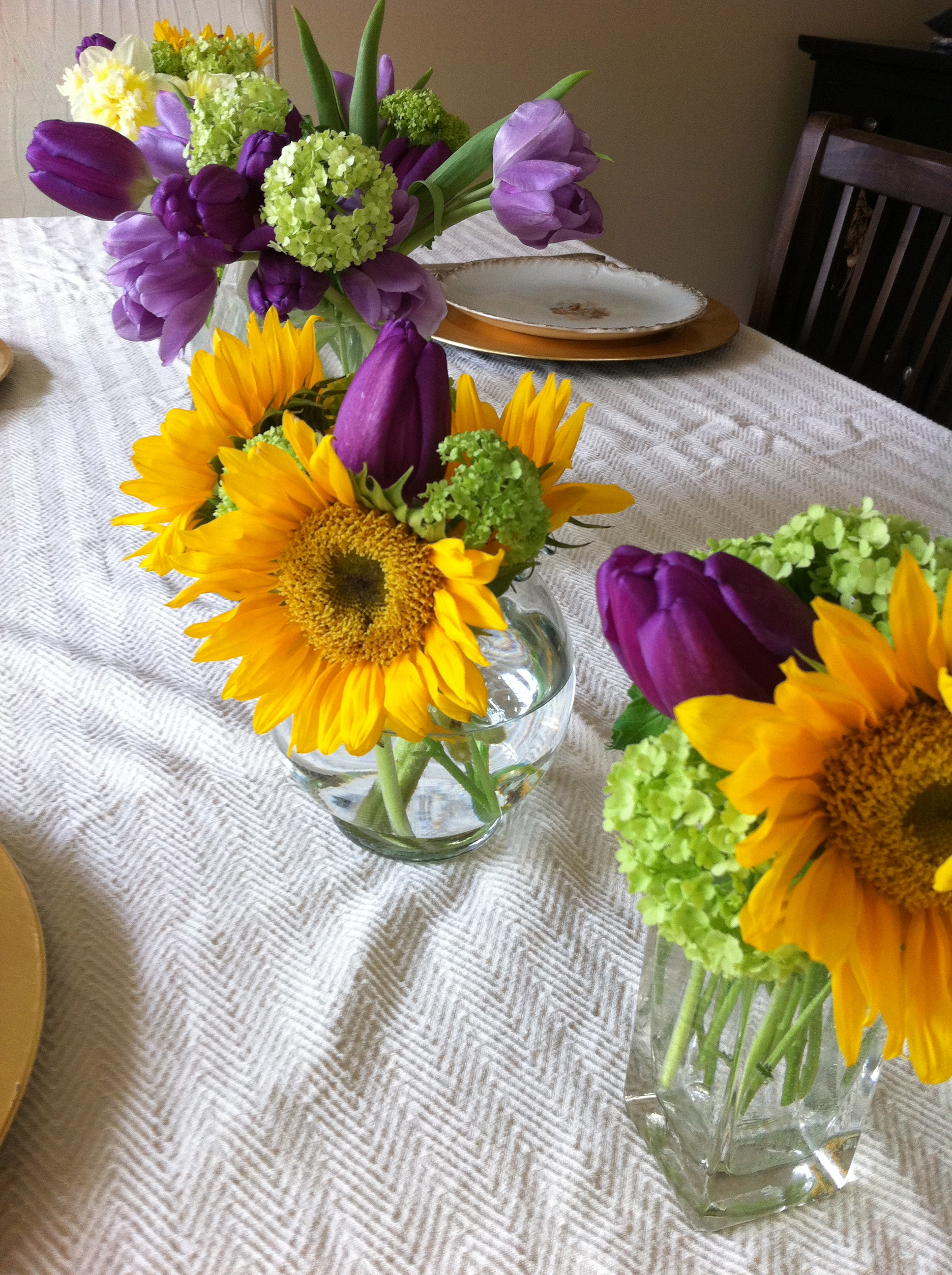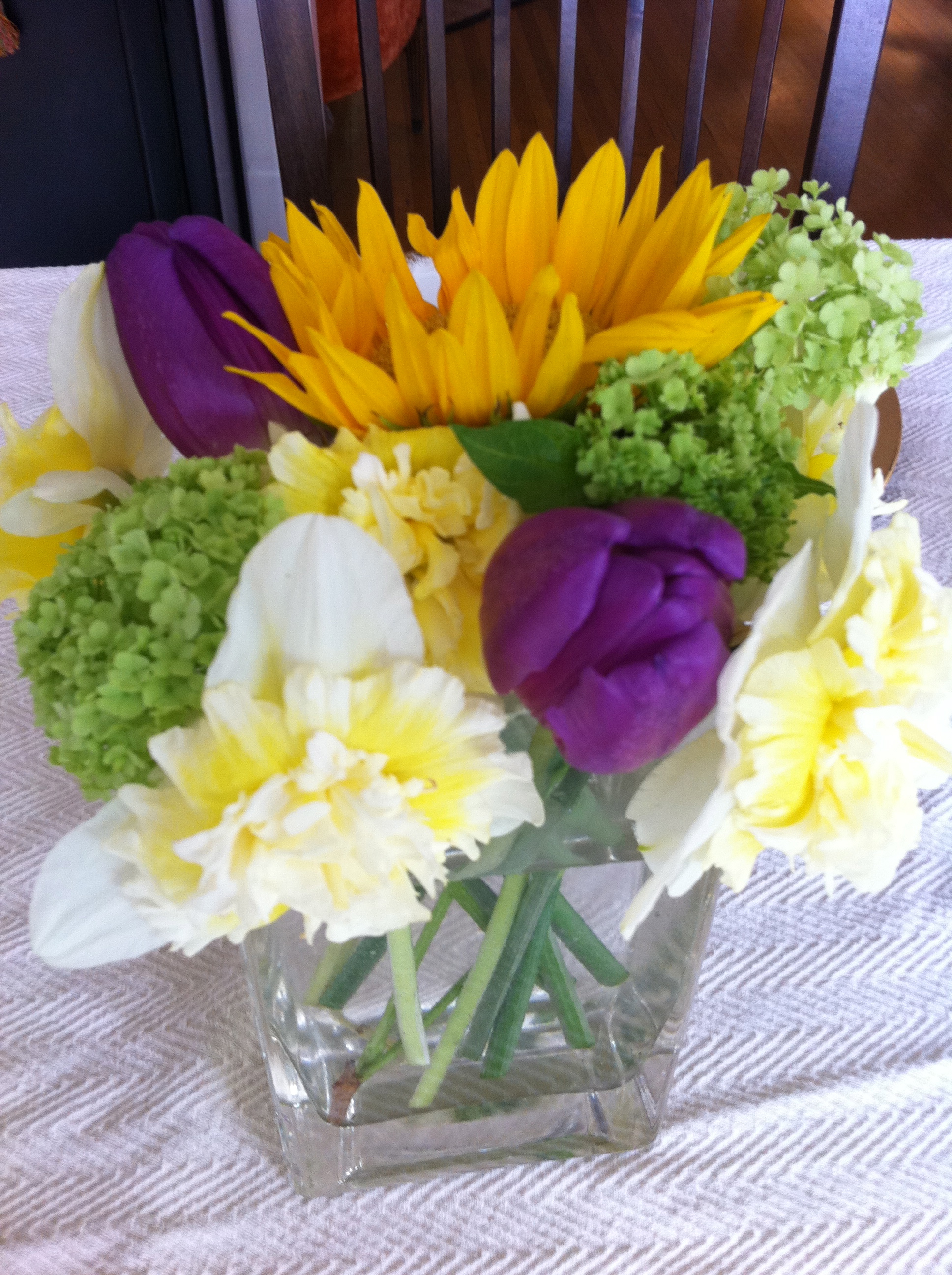 Flowers cannot be ignored. I was able to purchase one bundle of double creamy white daffys ($6 bucks), and add them to the left over purple and gold birthday flowers along with some gorgeous viburnum (that were being thrown out, and I asked to have/rescue)