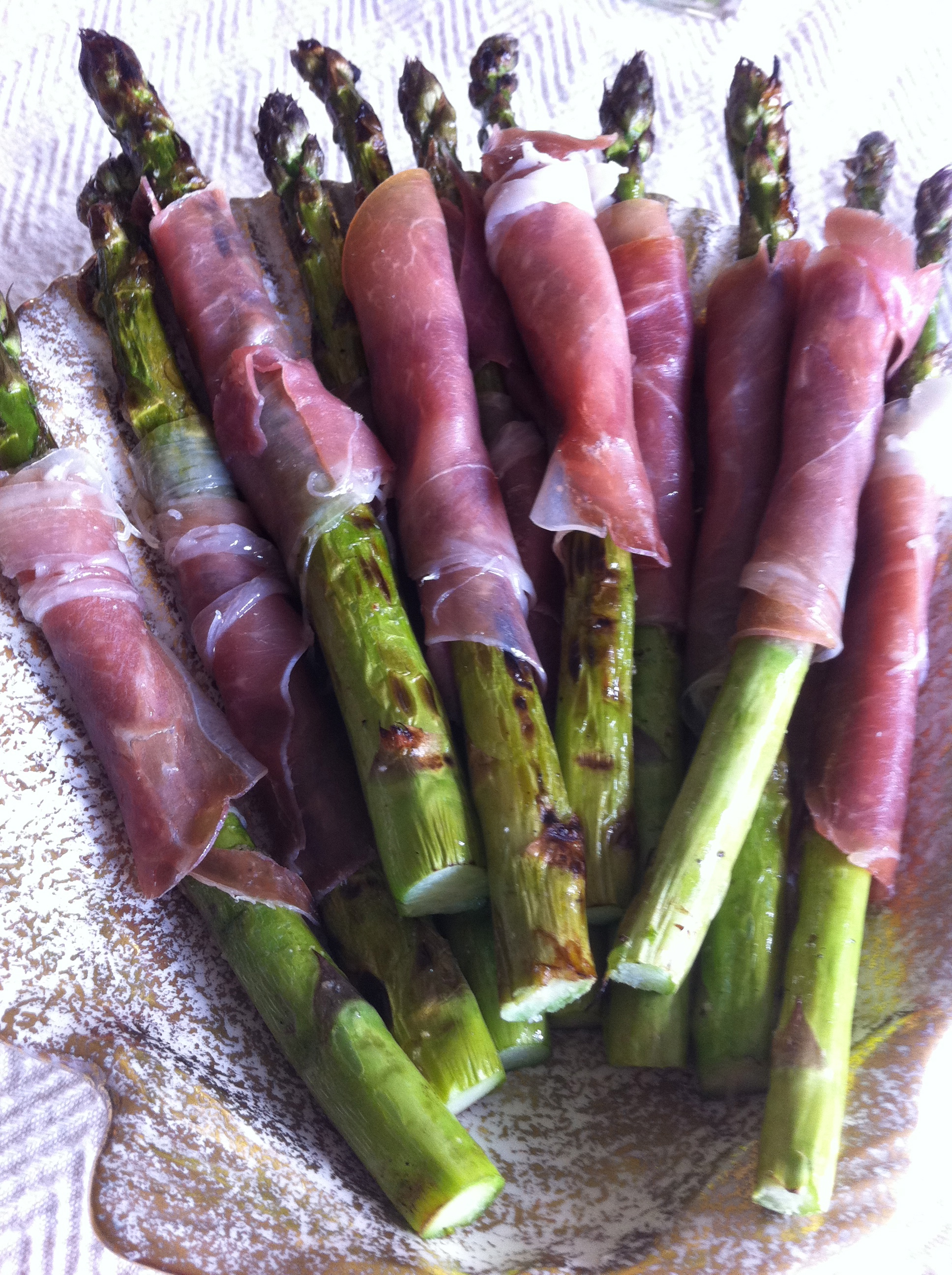 Asparagus is a pretty typical Easter fare, we went with it not because of tradition, but because they looked great at the market. We simply trimmed, coated with olive oil, salt and pep. and threw on grill for some appealing grill lines. Then we wrapped the spears with prosciutto. Easy and pretty–bingo.