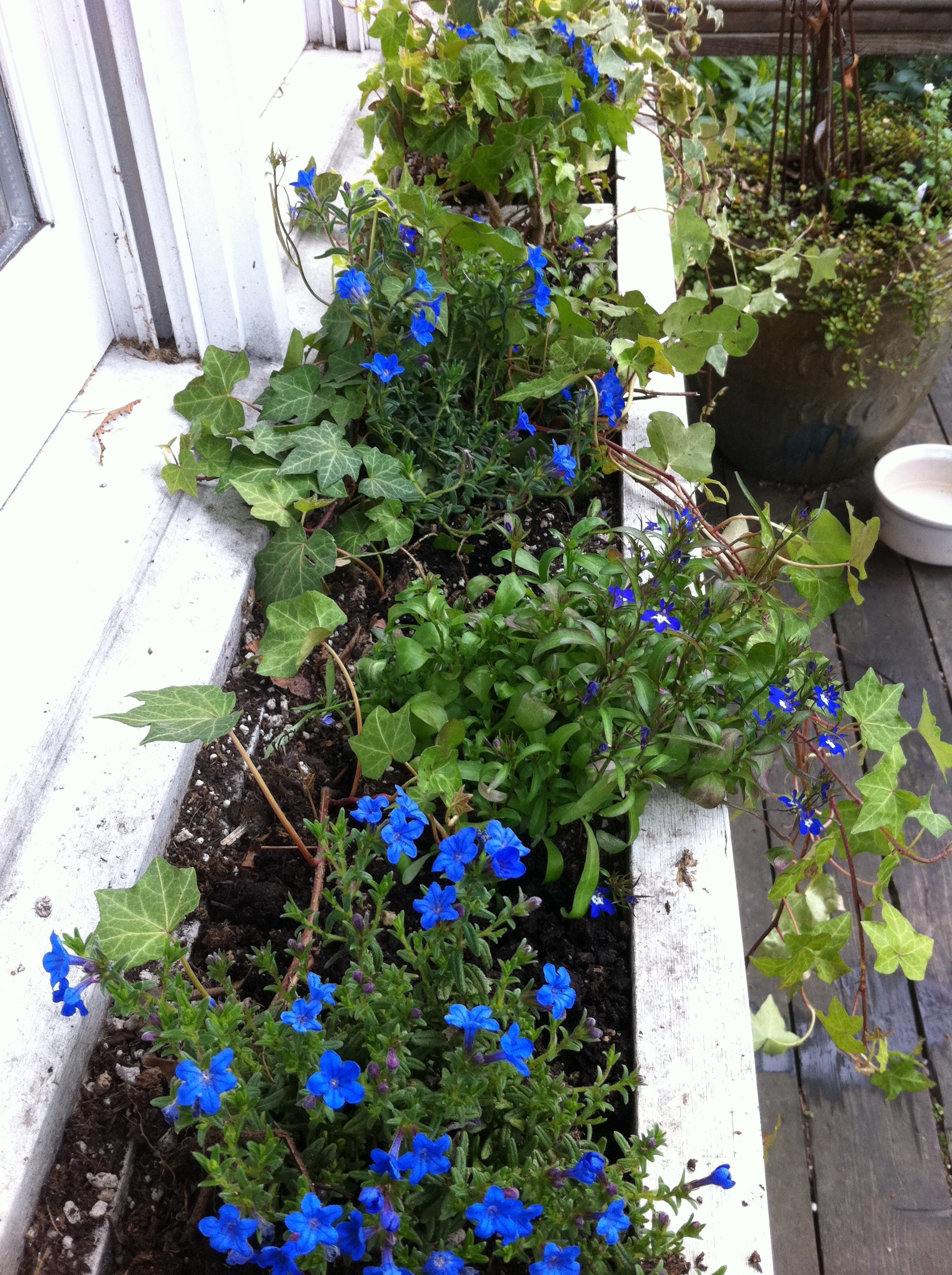 to the “latest” this weekend; now filled with cascading English Ivy, cobalt colored Lobelia and gorgeously bright blue Lithodora–for the time being. I tend to change it and add to it often.
