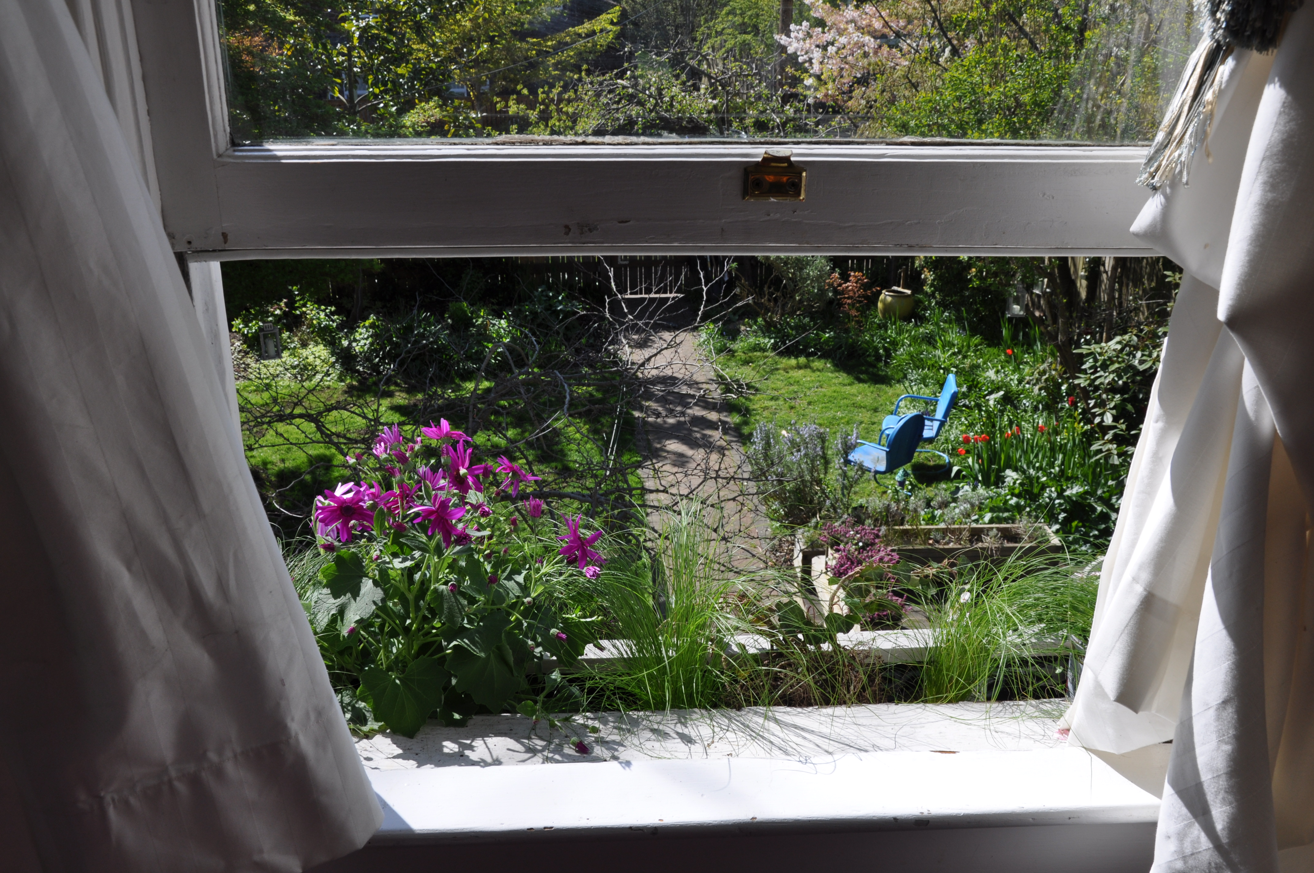 This is the view from the inside out. It is filled with more Rapunzel-like cascading ivy (I transplanted some from the lower one and dug some up from my yard for long sweeps, resourceful eh?), breezy grasses, and magenta Pericallis, sweet pale pink Diascia. I also have some bright green sweet potato vine to plant and some natural fertilizer to make everything look BIG, I’ll take a picture and post in a few weeks again. Now, if we can just keep that sun shining, as it did all weekend…