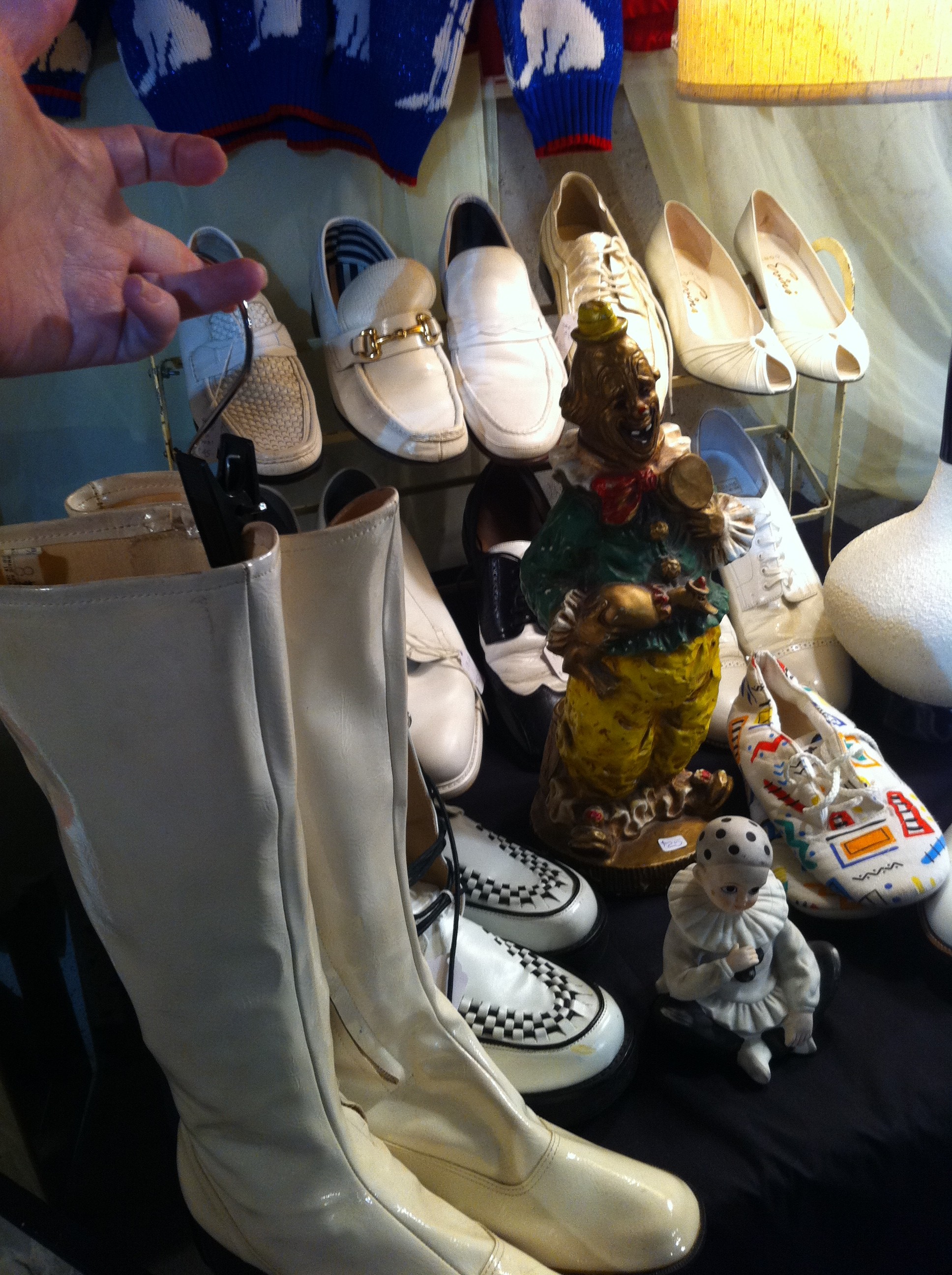 Intrigued by this vignette of white shoes in “the garage”. Cousin Eddy anyone? I was tempted with the go go boots, but too much of a heel for me in my current state, still.