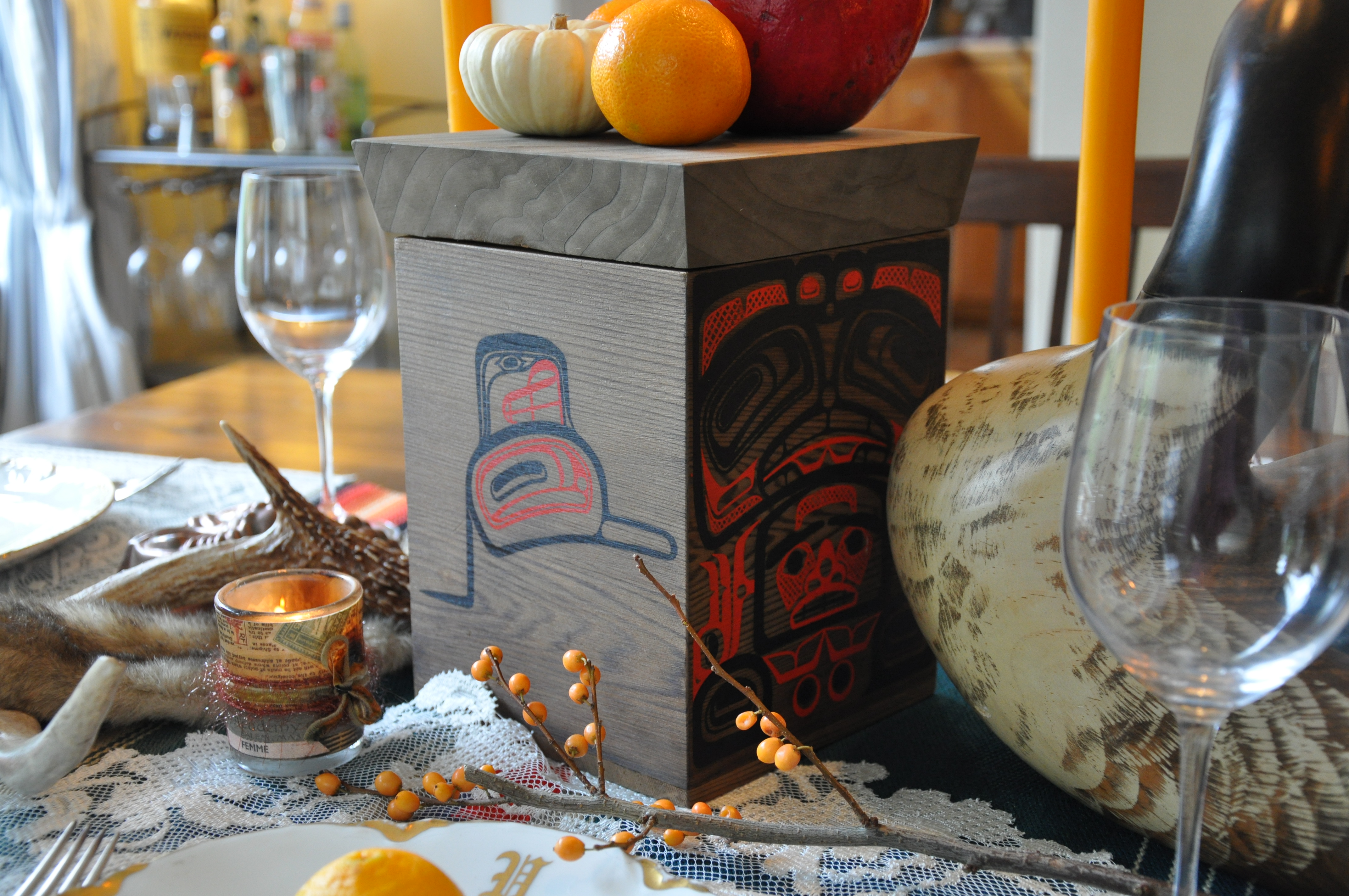 Now is probably the time to confess that much of the table inspiration came from a visit to Mort’s Cabin. I was so enamored with Mort’s amazing collection of Pendleton blankets, antlers, Northwestern art, like the GORGEOUS hand carved/painted boxes, made by local artist, Louis Larson.