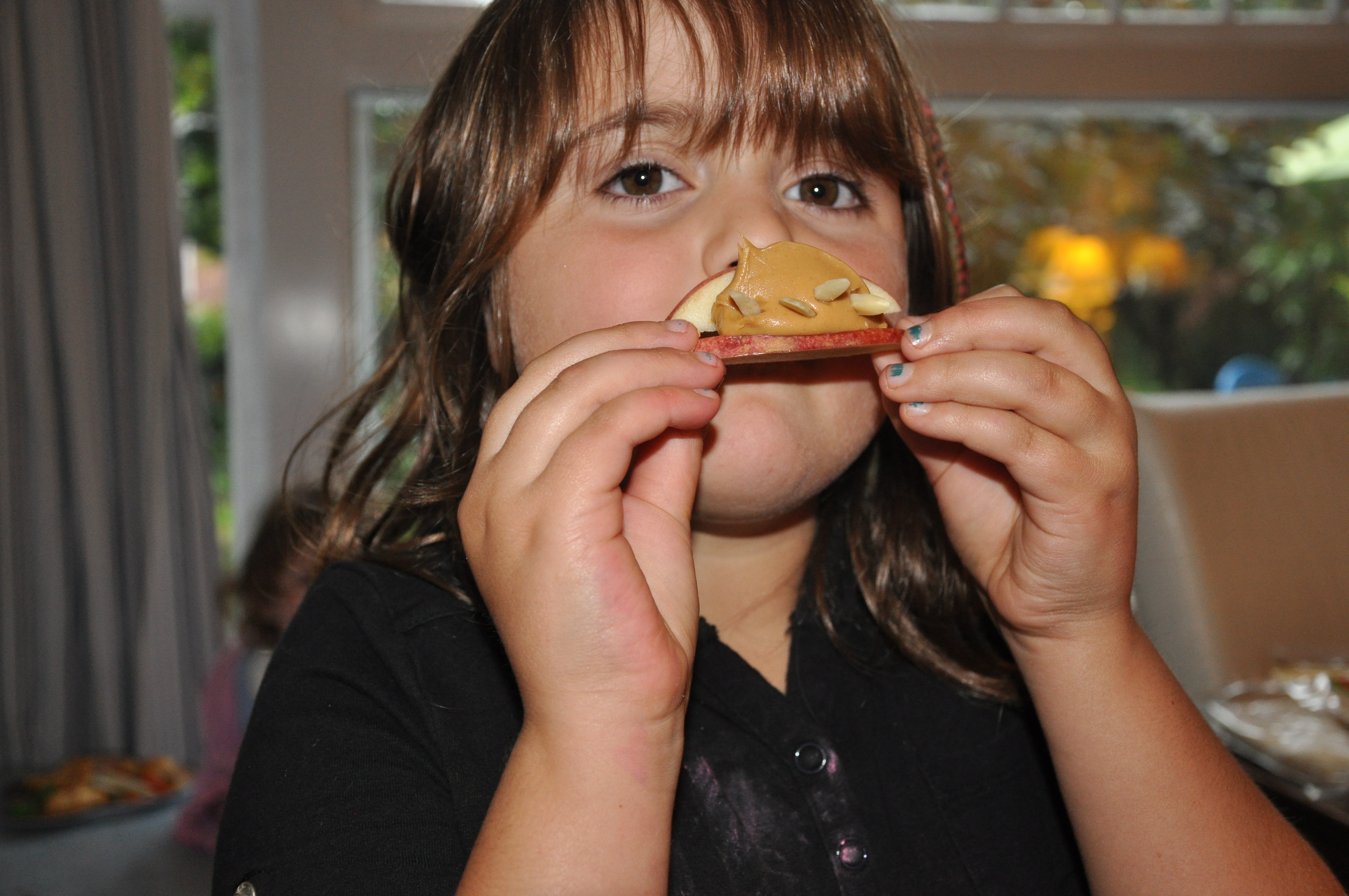 Easy and fun to make: slice red apple, fill with peanut butter so that the skin of the apple shows, and add fangs (or almond slivers if you’re being technical)