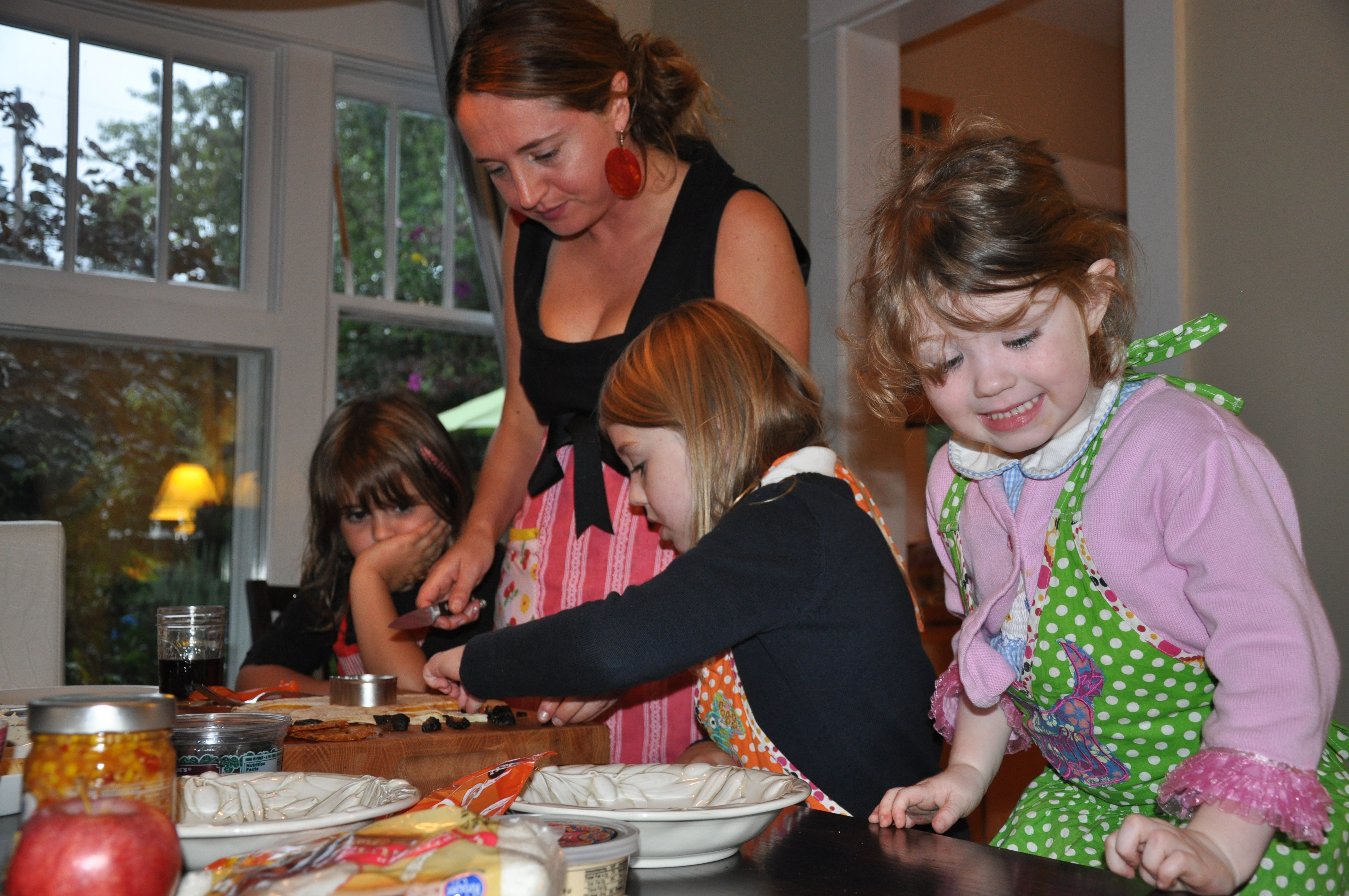 In addition to the kid version, we made an adult version. While they tasted delicious, they didn’t photograph well. We used apples and pears, subbed goat cheese for the peanut butter and then used the same almond “teeth” oh and experimented with a piece of prosciutto dangling out for the tongue, can you picture it?
