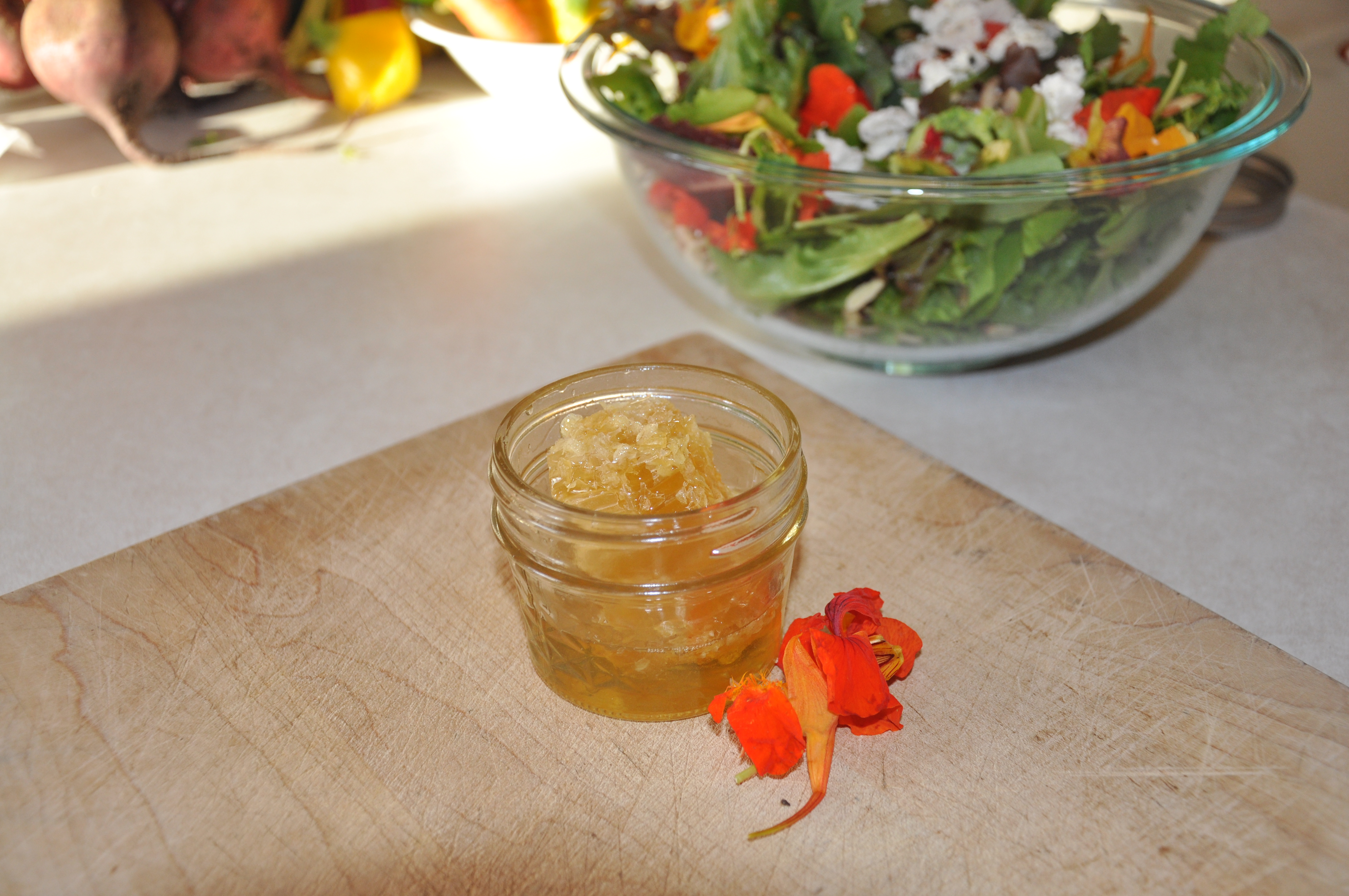 Fresh honey (by the way, did you beekeeping is somewhat the trendy new hobby?) to whop up a delish salad dressing. Do you see all the other market produce lurking in the background?